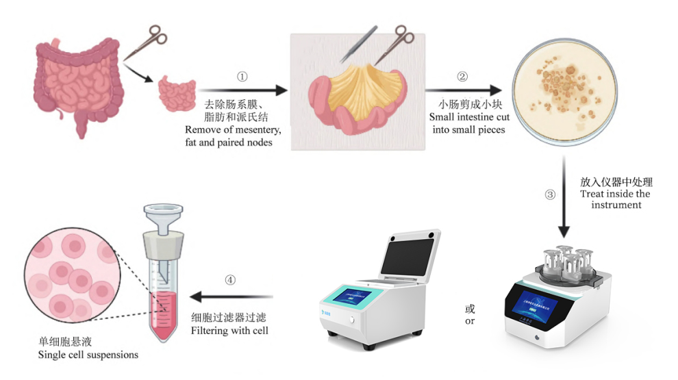 將消化管放入單細(xì)胞胞懸液制備儀上,選擇對應(yīng)的腸道程序,程序結(jié)束后,儀器自動停止,然后加入終止液,離心,棄掉上清,用培養(yǎng)基重懸即可得到小腸固有層單細(xì)胞懸液。(如下圖)