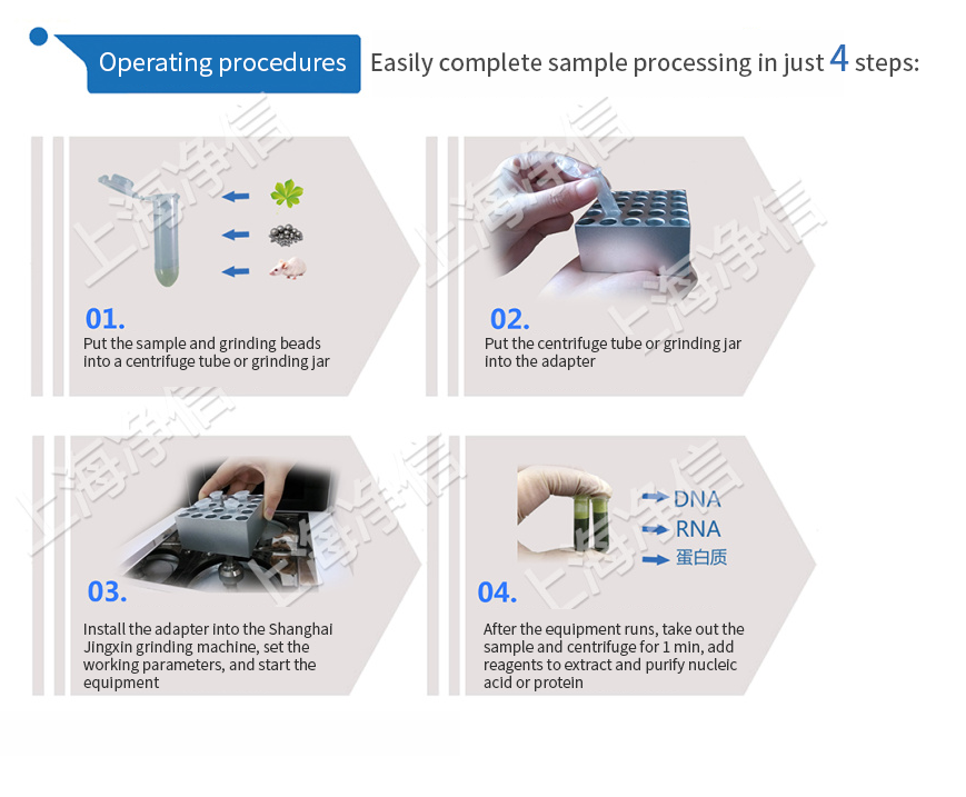 Shanghai Jingxin?'s high-throughput tissue grinder (patented product, counterfeit must be investigated! ZL2018300207398) is a special, fast, high-efficiency, multi-test tube consistent system. It can extract and purify the original DNA, RNA and protein from any source (including soil, plant and animal tissues/organs, bacteria, yeast, fungi, spores, paleontological specimens, etc.).
