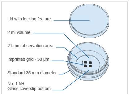 Also available in a Grid-500 version with ibidi Polymer Coverslip Dish 35 mm, high Grid-500 or μ-Slide 8 Well Grid-500