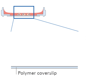 The μ-Dish 35 mm, low comes with a thin ibidi Polymer Coverslip Bottom that has the highest optical quality (comparable to glass) and is ideally suitable for high-resolution microscopy. It is also available as μ-Dish 35 mm, low Glass Bottom with a #1.5H Glass Coverslip Bottom for TIRF or single molecule microscopy.