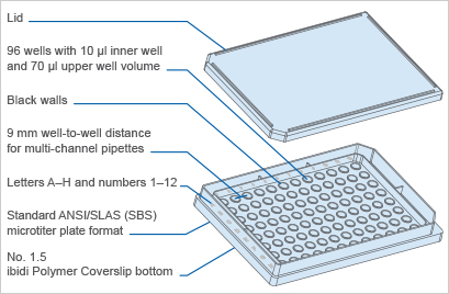 The μ-Plate Angiogenesis 96 Well can also be used as a low-volume microscopy chamber without any gel, which is useful for experiments where several wells with a low volume are required.