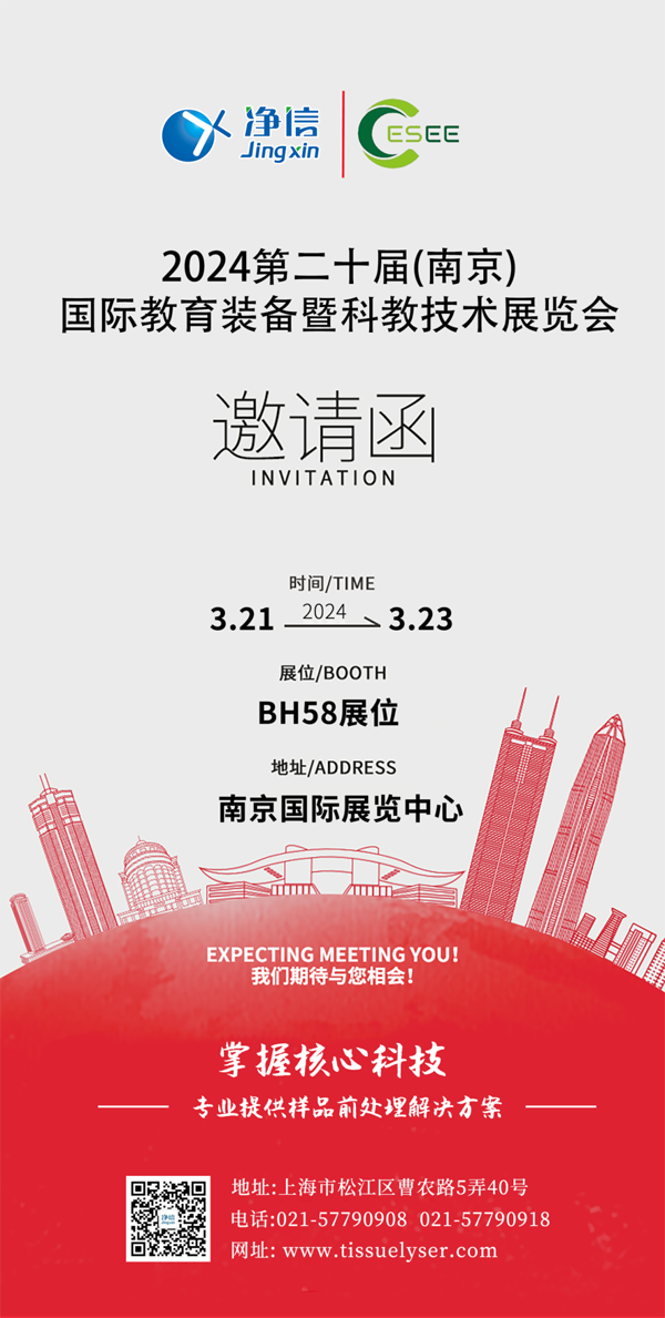 2024年3月21日至3月23日,第二十屆中國南京國際教育裝備暨科教技術(shù)展覽會(huì),將會(huì)在南京國際展覽中心舉辦。上海凈信將攜多款新產(chǎn)品出席亮相,包括凈信科研者系列新品、超聲波設(shè)備、研磨設(shè)備等等。誠摯地邀請您前來BH58展位暢談商機(jī),共話樣品前處理的技術(shù)和應(yīng)用。