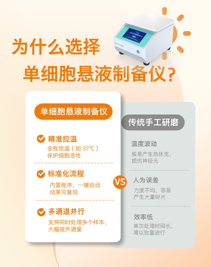 背景介紹:在神經(jīng)科學(xué)研究中,小鼠腦組織的解離一直是一道“硬骨頭”。傳統(tǒng)的手工研磨不僅耗時費(fèi)力,更常因機(jī)械剪切力過大或溫度控制不均,導(dǎo)致細(xì)胞受損、活率低下。今天,我們分享一款儀器——單細(xì)胞懸液制備儀,讓您的實驗數(shù)據(jù)大大提升。