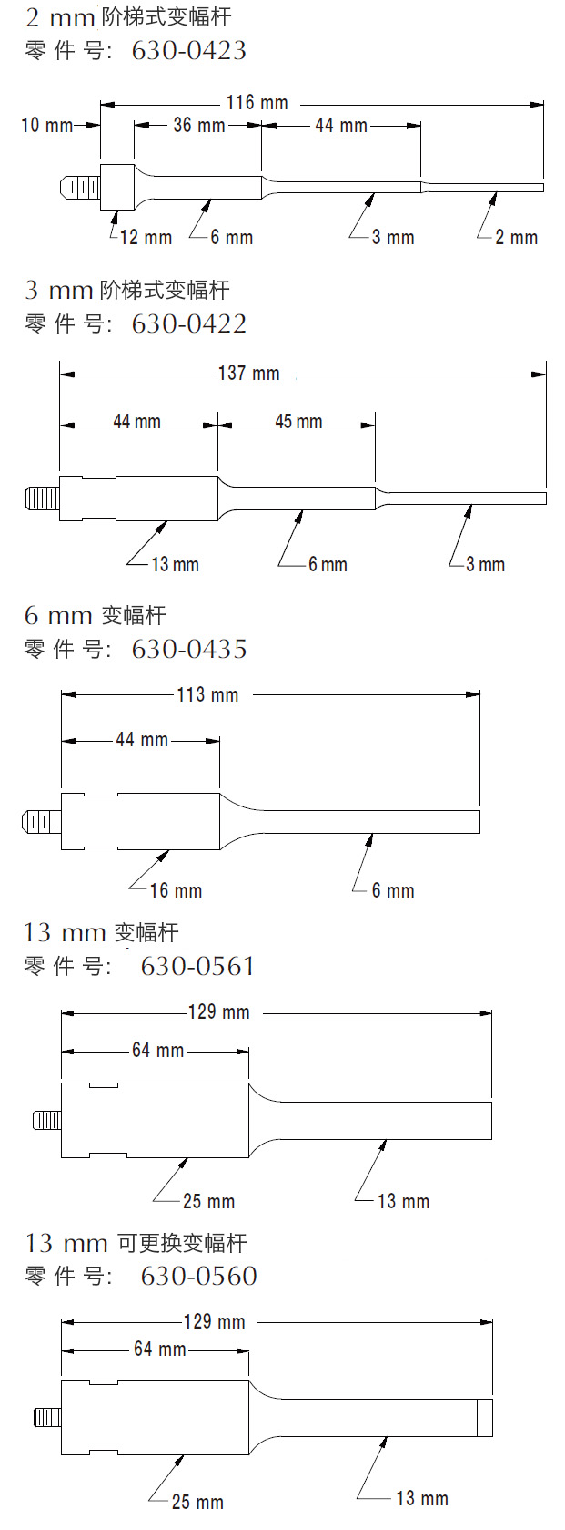 注:所有探頭和可更換探頭均由高等級(jí)鈦合金Ti-6Al-4V制成,可高壓滅菌。由于超聲波探頭調(diào)試到共振狀態(tài),其長(zhǎng)度可能會(huì)因鈦合金的彈性模量變化而略有變化。
