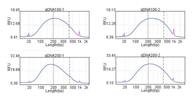 在投入量分別是200ng時,通過Qsep100片段分析儀檢測,打斷的DNA片段在200-400bp區間占比分別是47.7%、49.2%、49.1%;片段平均值分別是290.3bp、287.6bp、283.7bp,