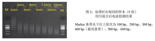 4、相同處理時長的樣本混合后,瓊脂糖凝膠電泳檢測結果